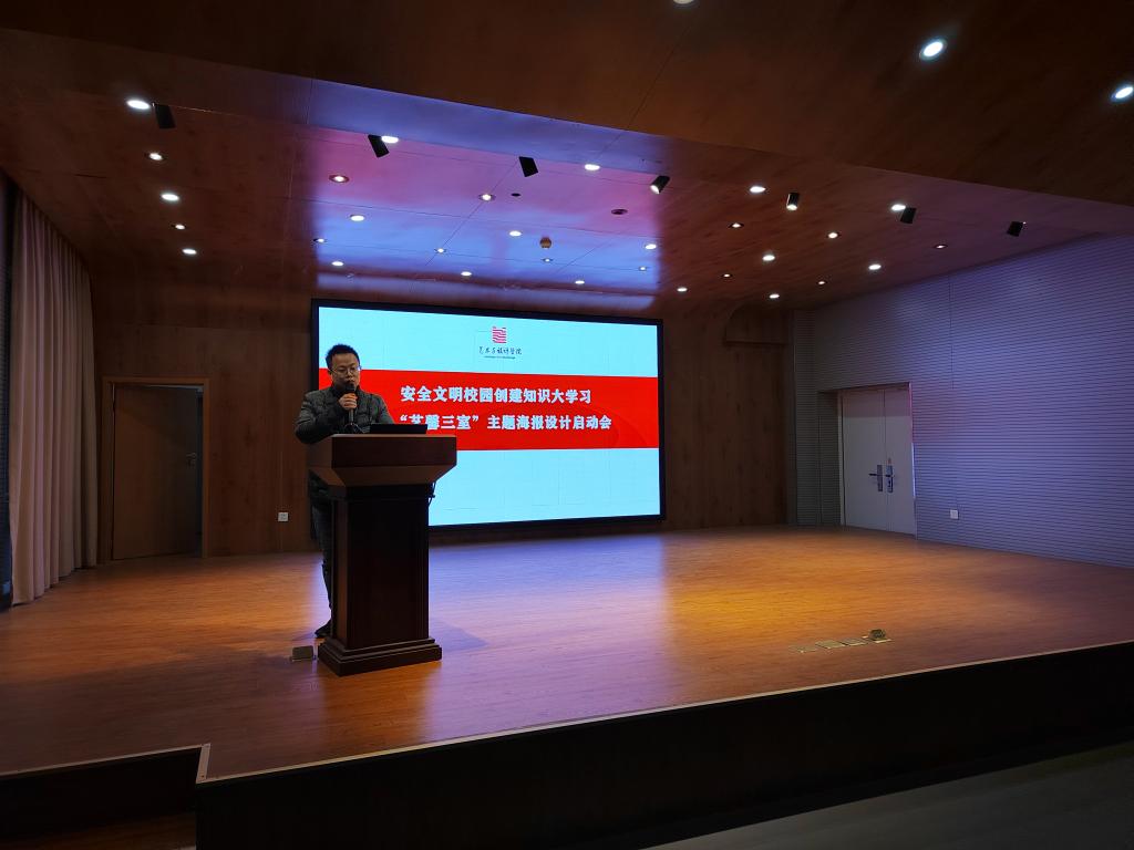 开展安全文明校园创建知识大学习暨“艺馨三室”主题海报设计启动仪式。仪式由学院分团委书记汪正主持,实验中心主任杨媛主讲,全体辅导员、实验中心全体教师及100余名学生代表共同参加。