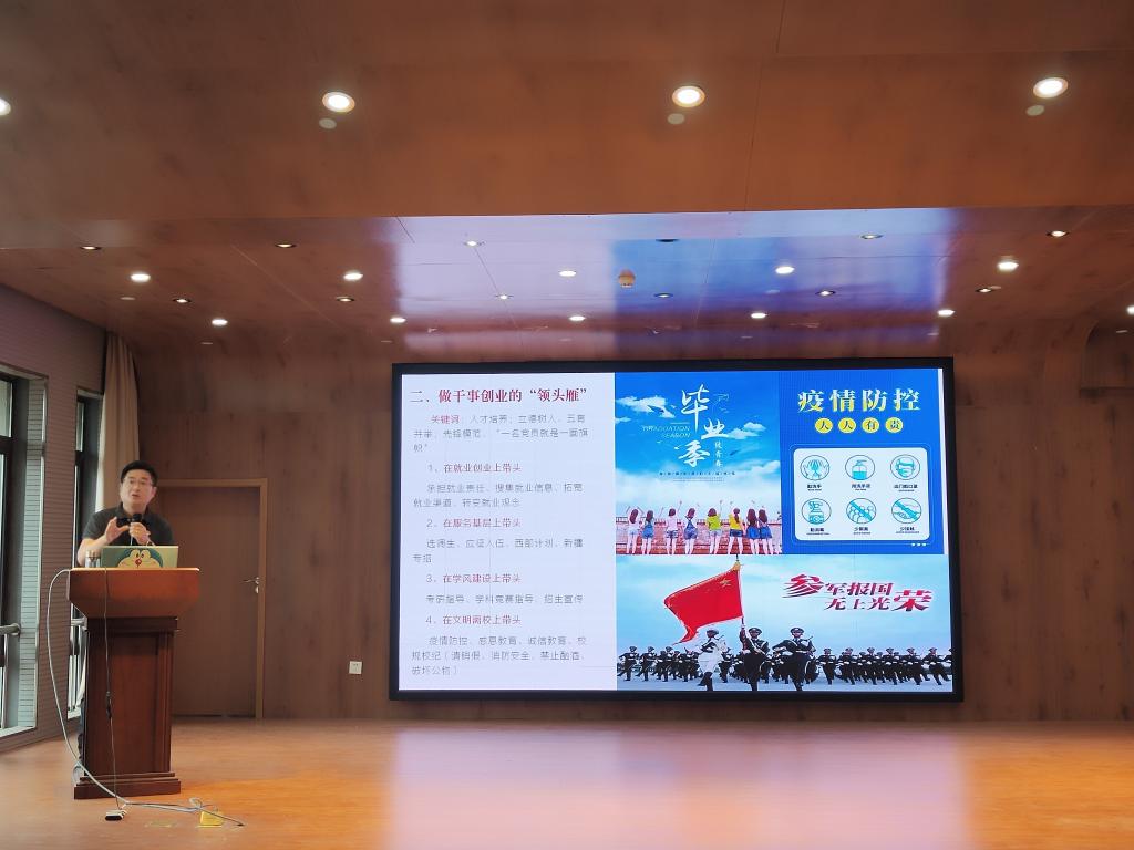 方勇以“当好三个角色,争做疫情防控和文明离校先锋”为主题展开此次主题党课,号召全体学生党员一是要做政治坚定的“明白人”,以2022年国内外形势引入,希望毕业生党员能增强党员意识、坚定政治立场、强化政治引领、注重学以致用;二是要做干事创业的“领头雁”,在就业创业上带头、服务基层上带头、学风建设上带头、文明离校上带头;三是要做凝心聚力的“吸铁石”,响应文明离校倡议、开展主题党日活动、完成组织关系转接、防范化解安全风险。