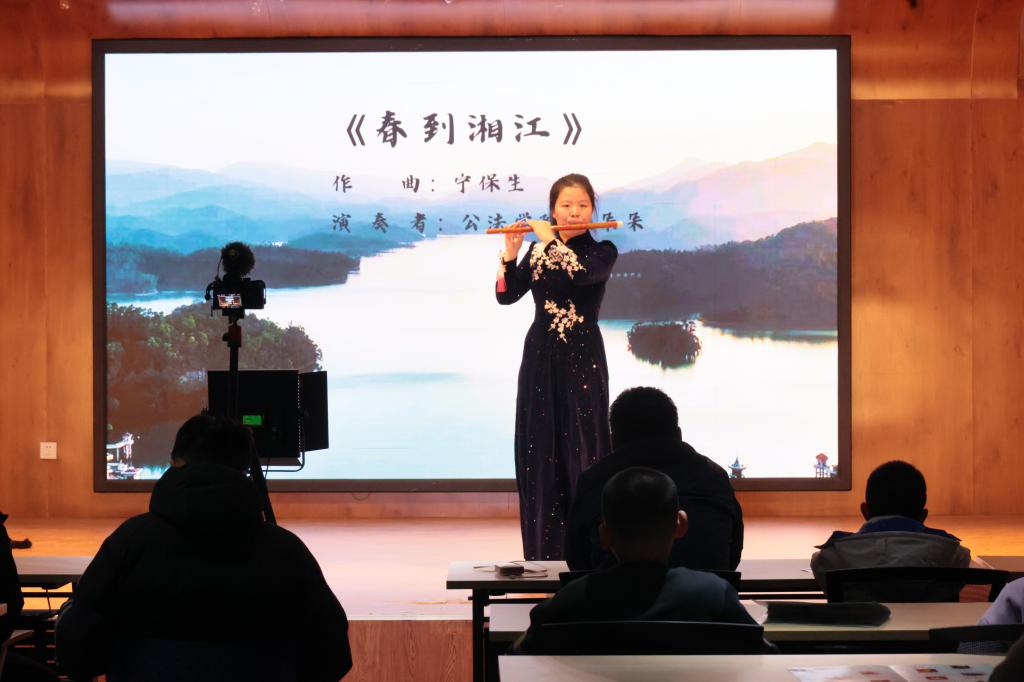整场音乐会共设计了13个节目,主要由古筝、琵琶、二胡等中国传统乐器以独奏形式进行表演。由民乐小合奏的《彩云追月》作为开场曲目,小提琴、中提琴和大提琴搭配融合出轻快独特的曲调,轻松呈现出江南丝竹小轻细雅的独特韵味,引人入胜。紧接着是一首笛子独奏《春到湘江》,清脆的笛声展现了湘江两岸秀丽的春光和人们欢欣鼓舞建设家园的壮志豪情。随之而来的二胡独奏《葡萄熟了》生动描绘了新疆人民在葡萄收获季节载歌载舞的动人场面,曲调优美,情绪热烈。竹笛独奏《跑旱船》与琵琶独奏《十面埋伏》先后进行,两首曲子节奏快速鲜明,演绎出波澜壮阔的音乐色彩,催人奋进。同时,听赏会现场还有古筝独奏的《彝族舞曲》、《秦土情》等。不同曲调风格的民族音乐,给听众带来了沉浸式的享受,让听众在民乐的悠扬中感受美的熏陶,感受民乐的独特魅力。每一位演奏者都致力将音乐的美妙展现于此,技法与情感交融,呈现了一场高质量音乐会。最后,听赏会在节奏鲜明的民乐合奏《云宫迅音》中圆满结束。