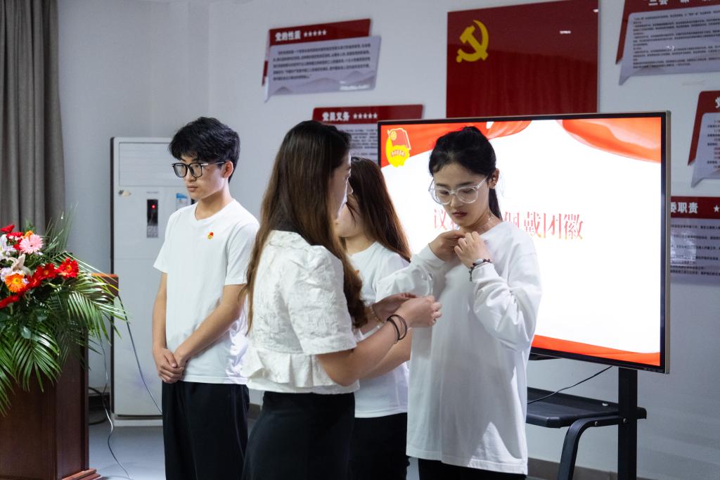 团委共有25名先进青年被发展入团。团徽是中国共青团的象征和标志,罗凡和优秀团员代表共同为新团员颁发团徽徽章。随后,全体新发展团员在新发展团员代表黄孝楠的带领下,举起右拳,面向团旗庄严宣誓。
