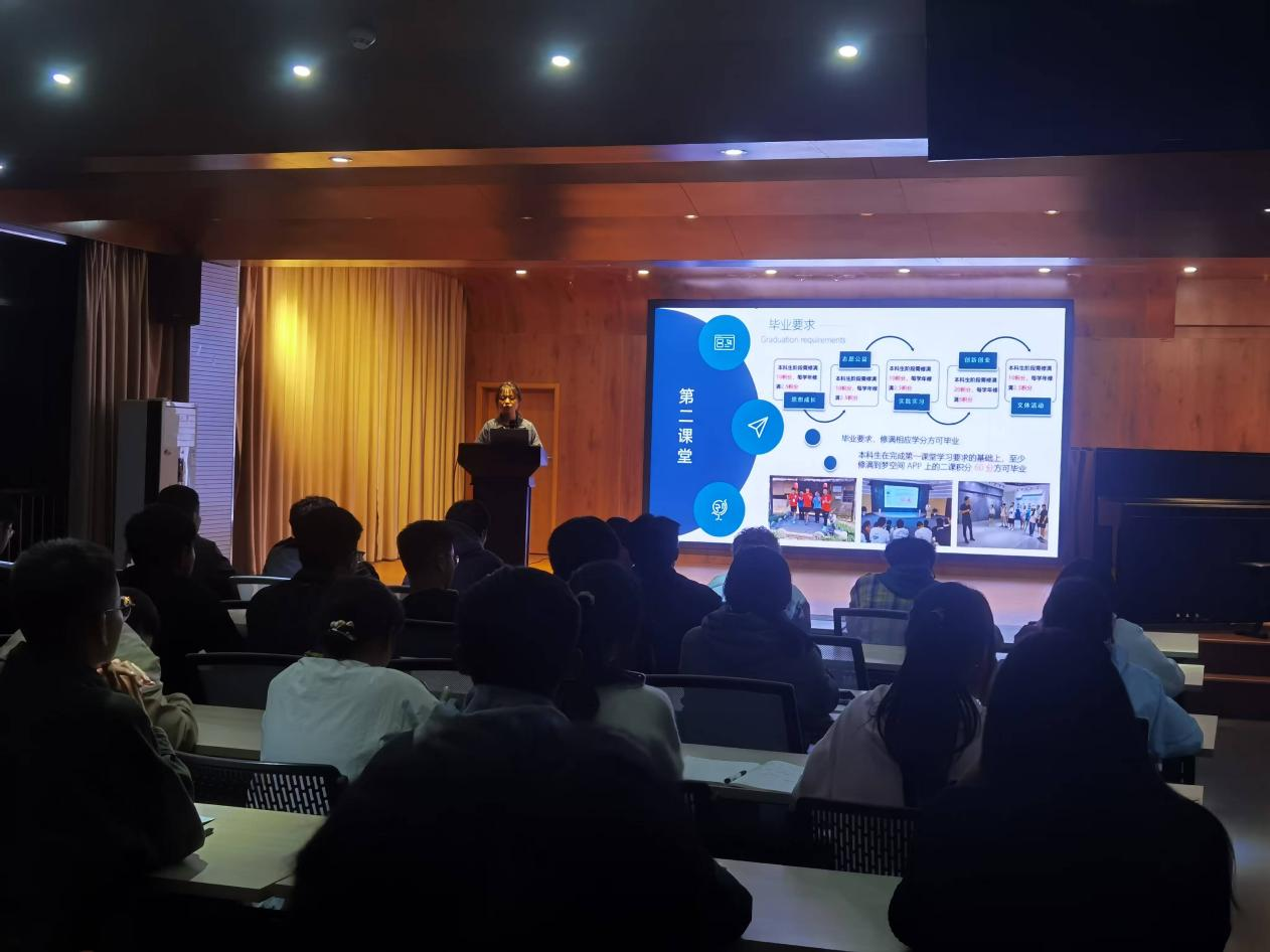 随后,邵星详细讲解了第二课堂的活动内容及参与方式。她介绍了思想成长、志愿公益、实践实习、创新创业、文体活动等多个板块的活动,并说明了如何报名参加、如何获得学分等具体细节。同时,她还鼓励学生们根据自己的兴趣和特长选择适合自己的活动,积极参与其中。在宣讲过程中,她还详细介绍了“到梦空间”APP的使用方法和功能,并现场演示了如何激活账号、如何查看活动信息、如何申请学分等操作。