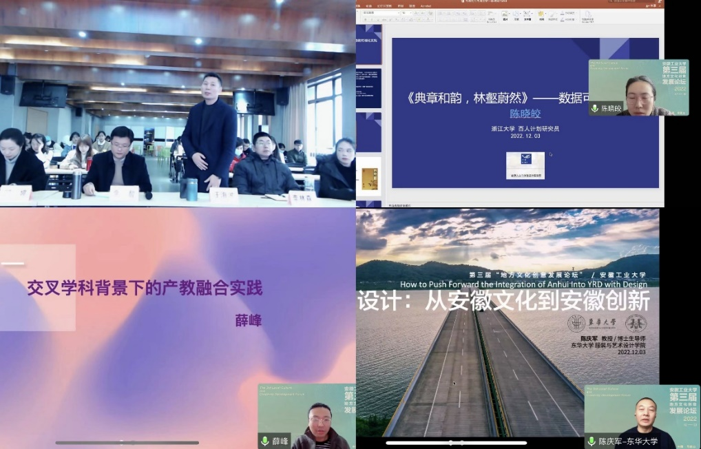 窗外数九寒天,屋内暖意盈怀!在12月3日上午的寒风中,艺术与设计学院成功举办了“第三届地方文化创意发展论坛”系列活动。浙江大学研究员、博士生导师陈晓皎,南京艺术学院传媒学院院长、博士生导师薛峰,东华大学博士生导师陈庆军作为嘉宾在线出席了论坛并做精彩报告。论坛学术召集人、艺设学院院长汪海波、副院长肖旺群、副院长庄德红,以及300余名师生代表、学界同仁参加论坛活动并聆听了报告。活动由视觉艺术设计系主任佘醒主持。