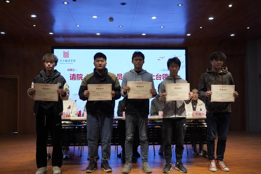 会议第二阶段,张辉对暑期社会实践成果进行总结报告,并对社会实践中各位同学的积极配合表示感谢。随后,刘慧洋宣读暑期实践先进个人表彰决定,大会进入颁奖环节,获奖同学分批次上台领奖并合影留念。大会最后,汪正指出本次表彰的目的是总结过去、展望未来,表彰先进、催人奋进,希望大家再接再厉共创艺设更好的明天。