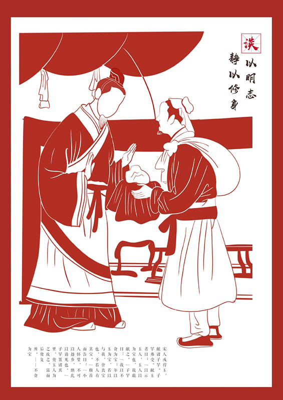 作品由艺设学院罗子越、张子影同学创作,以廉洁人物故事为主题,采用剪纸效果进行绘制,呈现“不贪为宝”、“羊续悬鱼”两个廉政故事,意指党员干部要遵从本心,不被利益所诱惑。