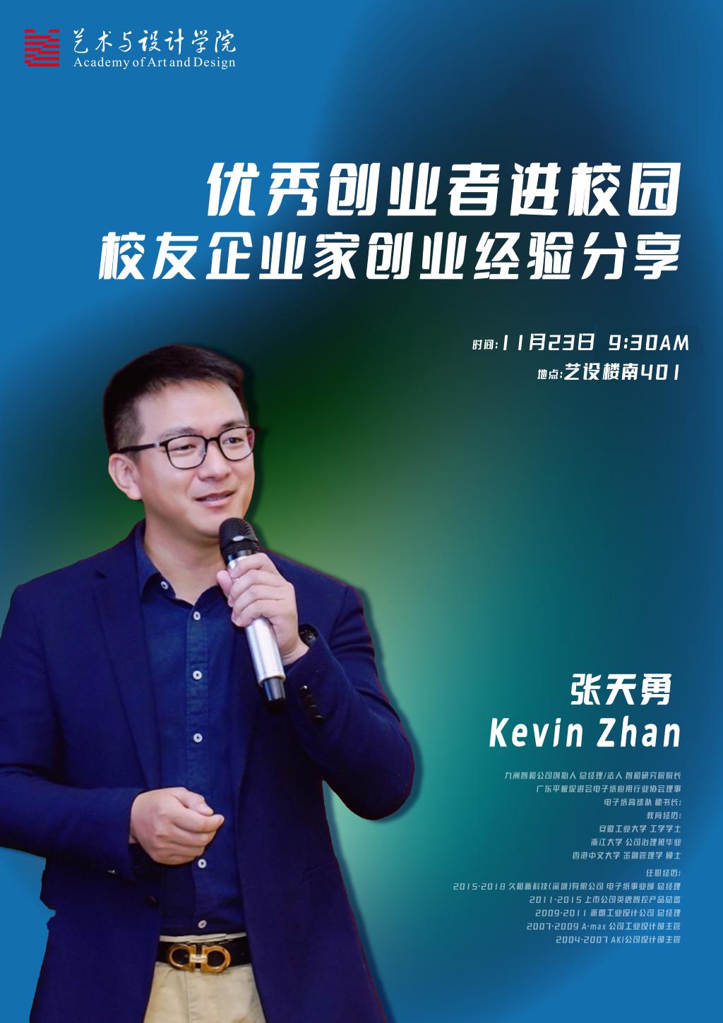 报告题目:优秀创业者进校园——校友企业家创业经验分享报告人:张天勇报告时间:2022年11月23日9:30报告地点:艺设楼401报告对象:porn直播 本科生、研究生报告人简介:张天勇,毕业于porn直播 工业设计专业,九洲智和公司创始人、总经理、法人,智和研究院院长 ,广东平板促进会电子纸应用行业协会理事,电子纸高球队秘书长。