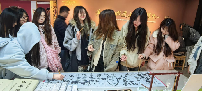 作为“流动的清明上河图”,屯溪老街承载着徽商文化的历史记忆。屯溪老街是保存完好的明清商业街,有很多老字号店铺,徽派建筑风格,还有手工艺品、美食等。同学们通过参观当地的非遗工作室及商业空间,了解了徽州书法、徽州雕刻等传统技艺。老师鼓励学生将非遗文化元素融入绘画作品,通过绘画的形式传承和弘扬徽州文化。