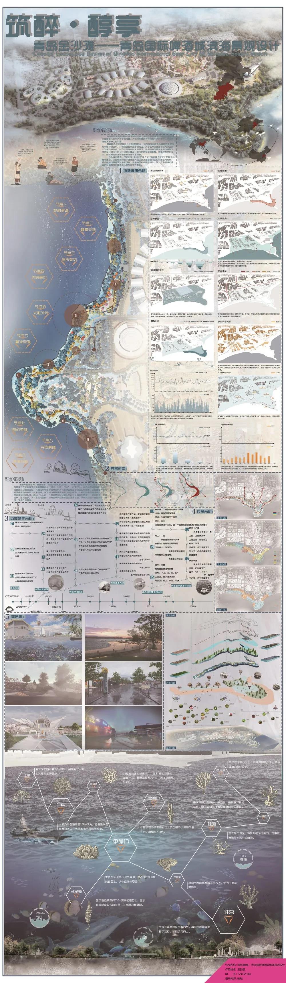 设计说明:通衢车马正喧闻,啤酒文化与海洋元素的碰撞与融合,结合景观三元论对啤酒城滨海景观带在“视觉、生态、行为”上的再设计,结合“天人合一”的思想,将“城市与自然”的景观序列空间体现的淋漓尽致,共展现出一幅现代的“清明上河图”的画卷。