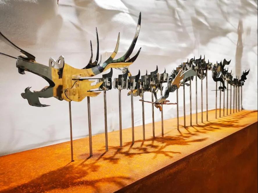 设计说明:动态公共艺术是一种在空间中可看可触的艺术表现形式,是表达广大公众审美感和审美理想的艺术。这件作品在设计上通过解构的设计手法对龙的形象进行了分解处理,在关键的结构部位重点突出龙的形象特征。从整体的设计理念来看,是艺术与科技,艺术与传统文化相结合的一次探索与实践。