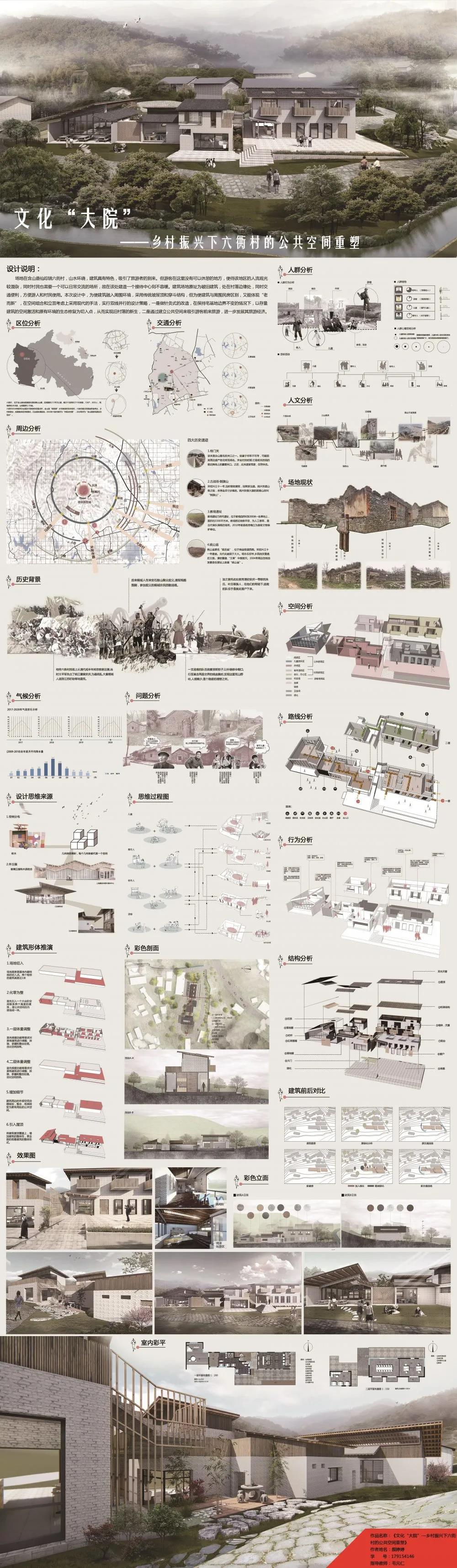 设计说明:场地位于含山县仙踪镇六衖村,山水环绕,景色优美,吸引了游客的到来。但游客在这里没有可以休憩的地方,使得该地区的人流观光较混杂,同时村民也需要一个可以日常交流的公共空间,故在该处建造一个接待中心刻不容缓。