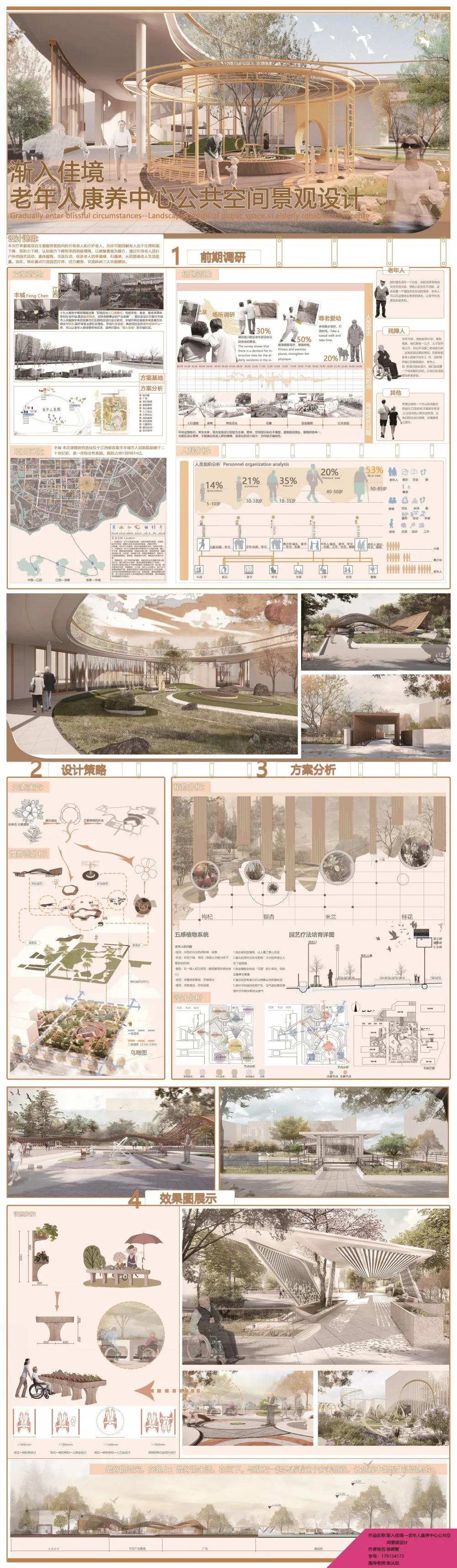 设计说明:本设计的设计理念是通过实地调研和现场分析,总结得出老年人康养类景观的设计原则,以及对公园中尚不完善的地方进行详细的分析并且提出优化设计,最后将应用于毕业创作之中,将康养类的景观更完善的展示出来。