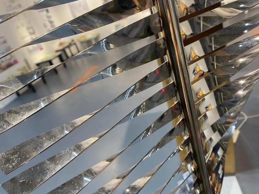 设计说明:伴随时代的发展,我们随父辈离开了故乡,辗转到城市生活。孩提时摸虾捕蝶捉蜻蜓的那群人那地方最终只成为了回忆和远方。骄傲孤寂的现代人,在冰冷的钢筋混凝土房,刺眼的玻璃幕墙里找不清方向。将密布城市的不锈钢,用艺术的手法创作一个抽象的蜻蜓形象。主体躯干采用镜面不锈钢,来反射各个方向。顶端两侧用绳子打造翅膀。随着机械装置的运作,让人能驻足观赏,回忆曾经自己的模样。