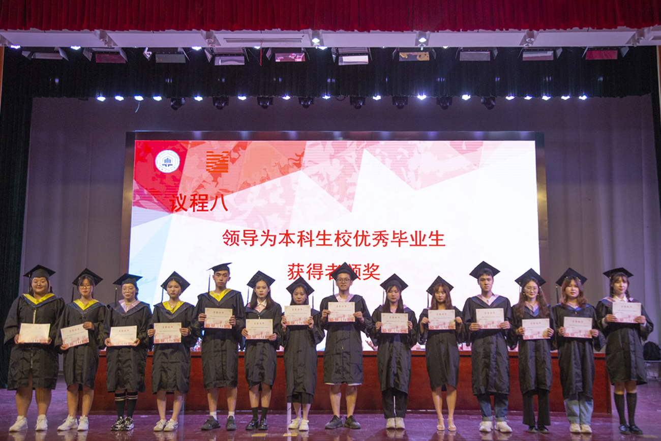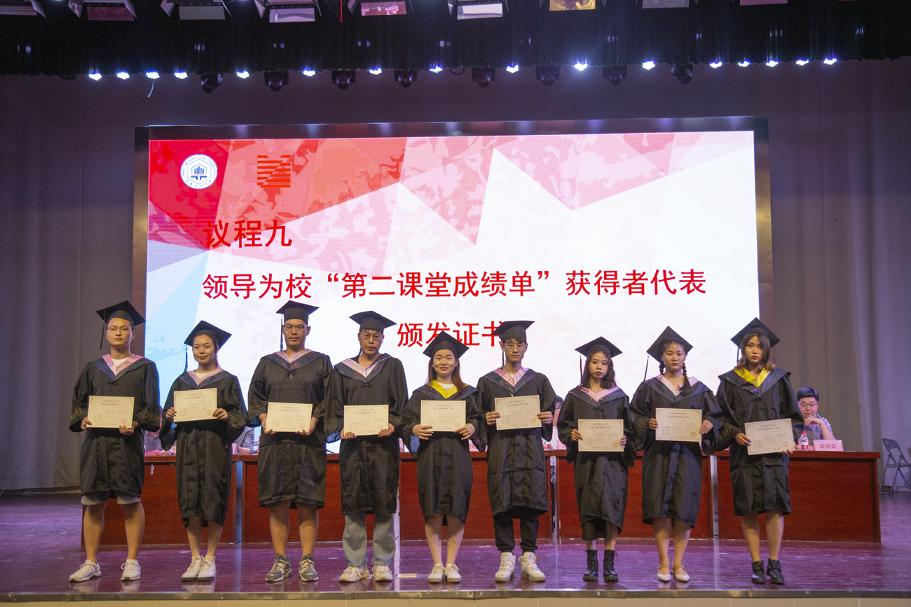 在欢快的音乐声中,领导们依次为本科生校优秀毕业生、“第二课堂成绩单”获得者代表、校友联络员代表颁发证书。副校长顾明言为研究生省优秀毕业生、本科生省“双优生”获得者颁奖,全场响起阵阵热烈掌声。